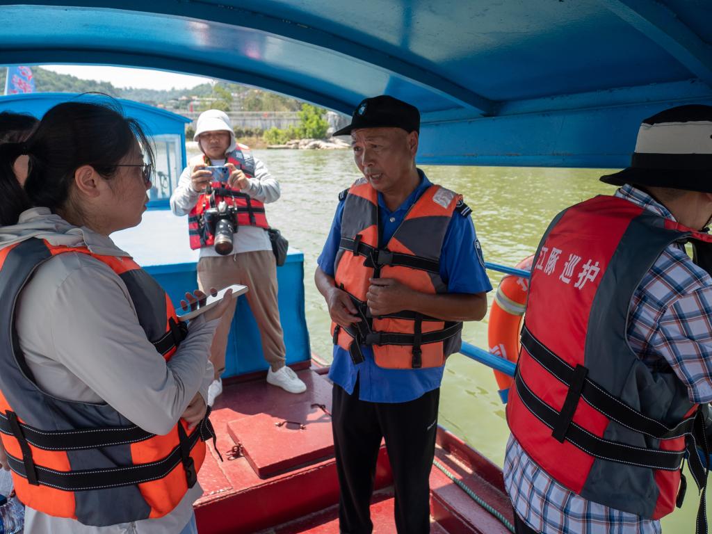 7月23日,江西省湖口县江豚协助巡护队队员向记者介绍巡护工作内容。新华社记者 郭杰文 摄