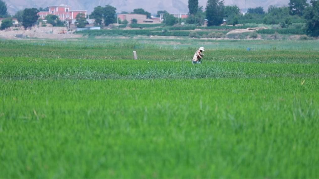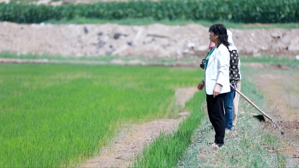 这里是甘肃省白银市靖远县北湾镇古城村的一处稻田。靖远县森茂种植养殖农民专业合作社负责人姚兰与合作社成员一起来到田间地头,整理田埂,查看秧苗长势。