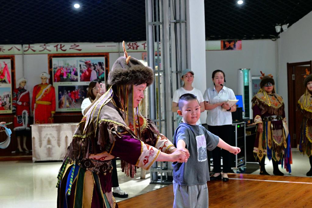 在展示馆二楼活态展示区,赫哲族演员头戴鹿角帽,身穿民族服装,跳起热烈的“温吉尼”舞蹈,为前来参观的游客带来一场神秘又震撼的视听盛宴。表演结束后,游客还可以走上舞台,和演员们学习萨满舞的舞蹈动作,体验赫哲族古老的文化。