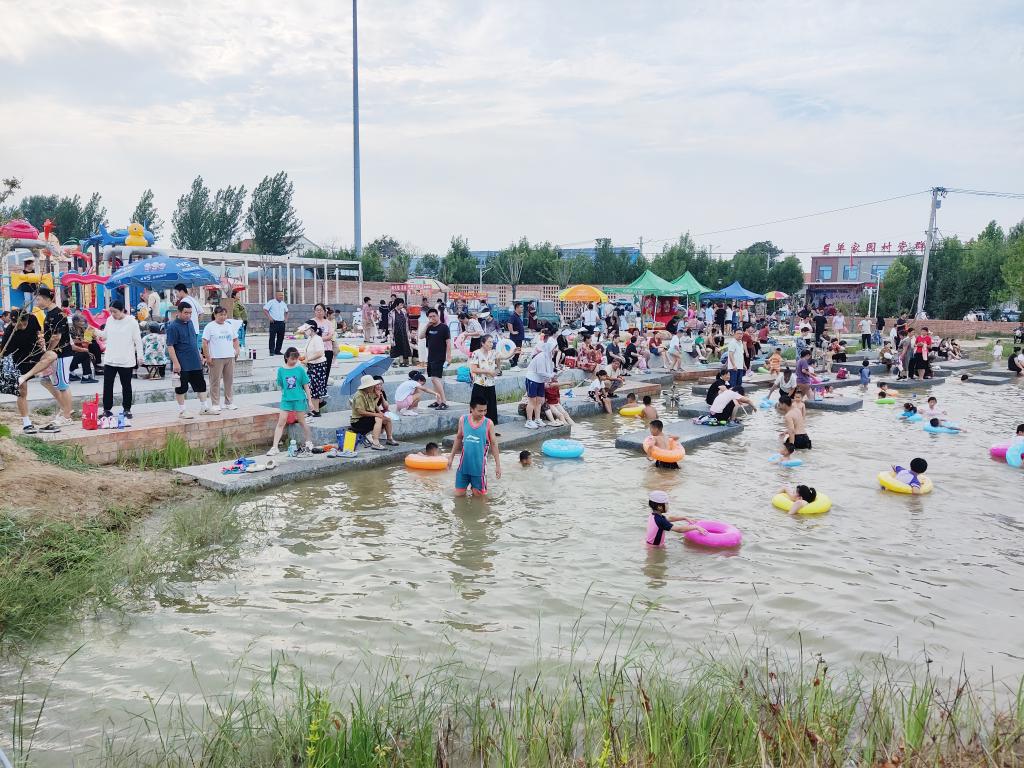 盛夏时节,走进山东省济南市商河县许商街道单家园村,只见一片田园绿野、青林秀水,碧波荡漾的池塘里荷叶随风招展,鱼儿们在水中游弋觅食。三五成群的游客有的带着孩子在沙滩边游玩,有的沿着平坦蜿蜒的道路骑车漫步,别有一番田园风味。