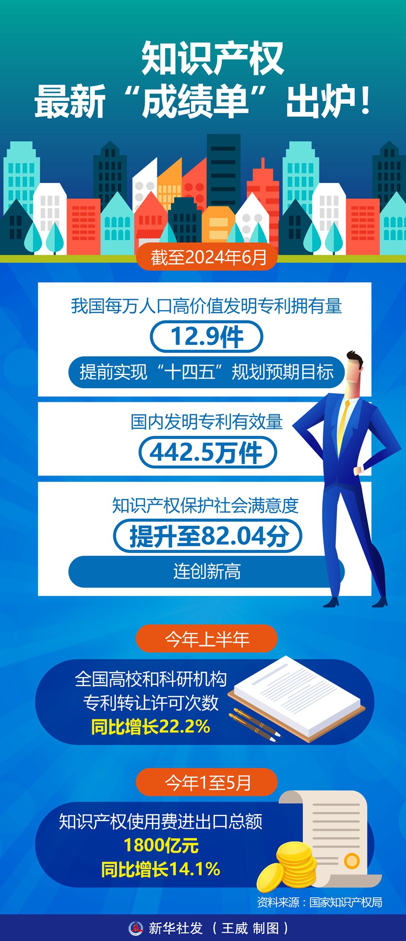 截至2024年6月,我国每万人口高价值发明专利拥有量达12.9件,提前实现“十四五”规划预期目标;国内发明专利有效量达442.5万件;知识产权保护社会满意度提升至82.04分,连创新高……