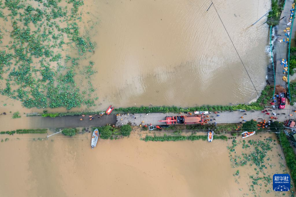 7月29日,在涓水湘潭县河口镇华中村堤段附近,抢险人员和设备进入险情现场(无人机照片)。新华社记者 陈思汗 摄