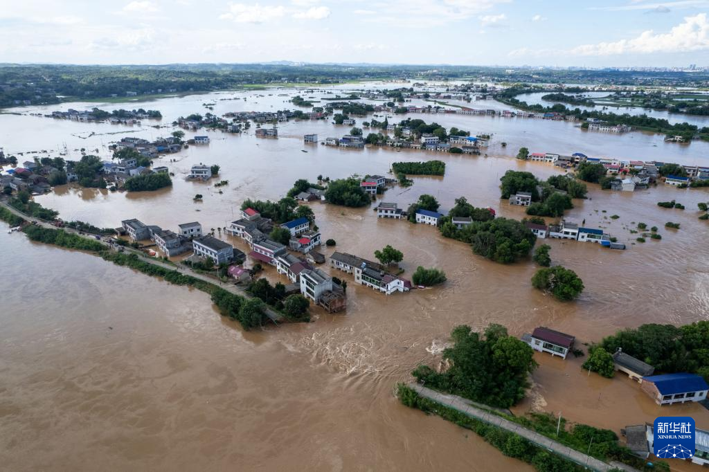 7月29日,在涓水湘潭县河口镇华中村堤段附近,抢险人员搜寻被困群众(无人机照片)。新华社记者 陈思汗 摄