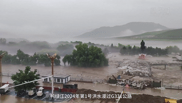 鸭绿江2024年第1号洪水漫过G331公路,让吉林省临江市大湖街道临城村和附近工厂一片泽国。