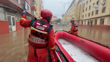 在G331公路一处积水路段,他们穿着厚重的急流救生衣,拖着冲锋舟向积水区域前进,只为探明水情。在建国街道解放社区,他们又划起了冲锋舟,为转移到高层楼的群众送去食物和饮用水。