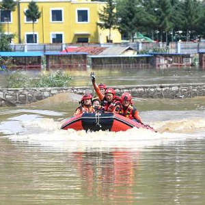 7月29日,在吉林省临江市,临江市消防救援大队世纪大街站消防救援人员利用橡皮艇转运受困群众。新华社记者张楠 摄