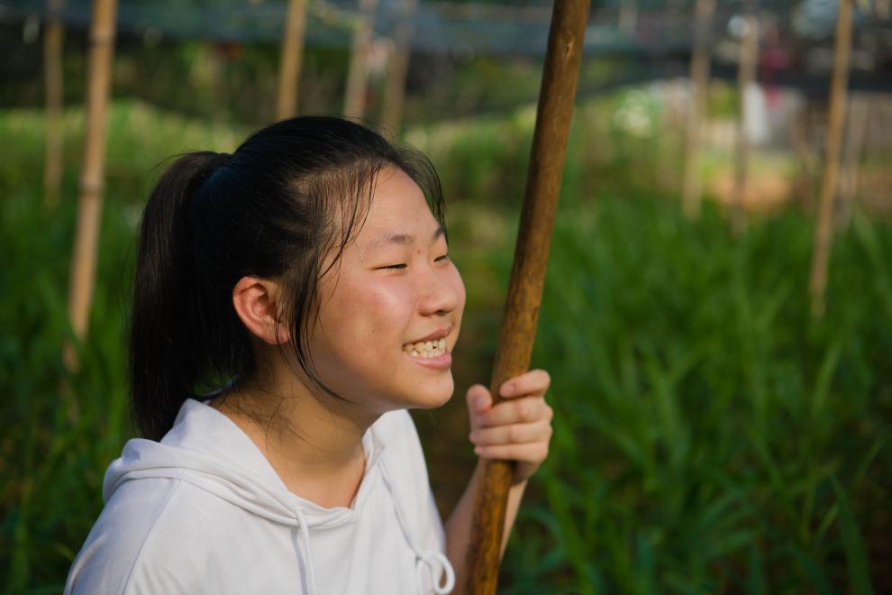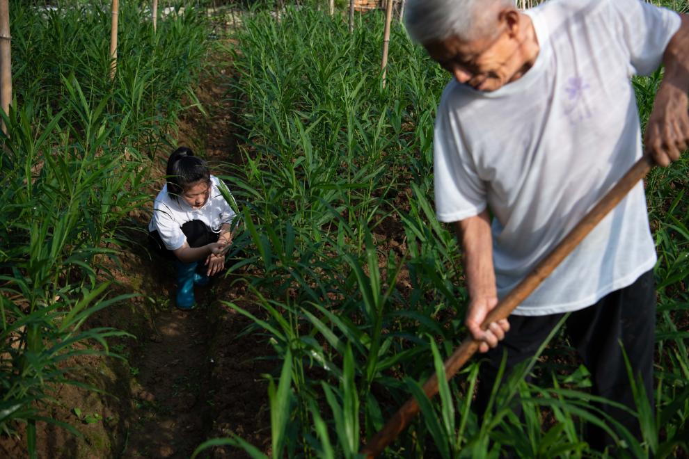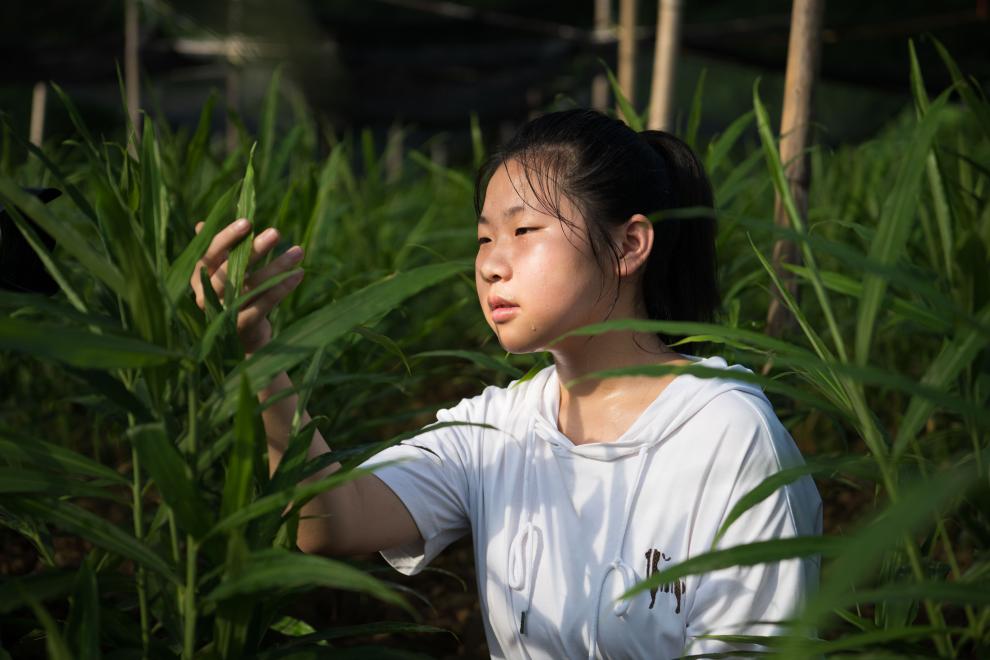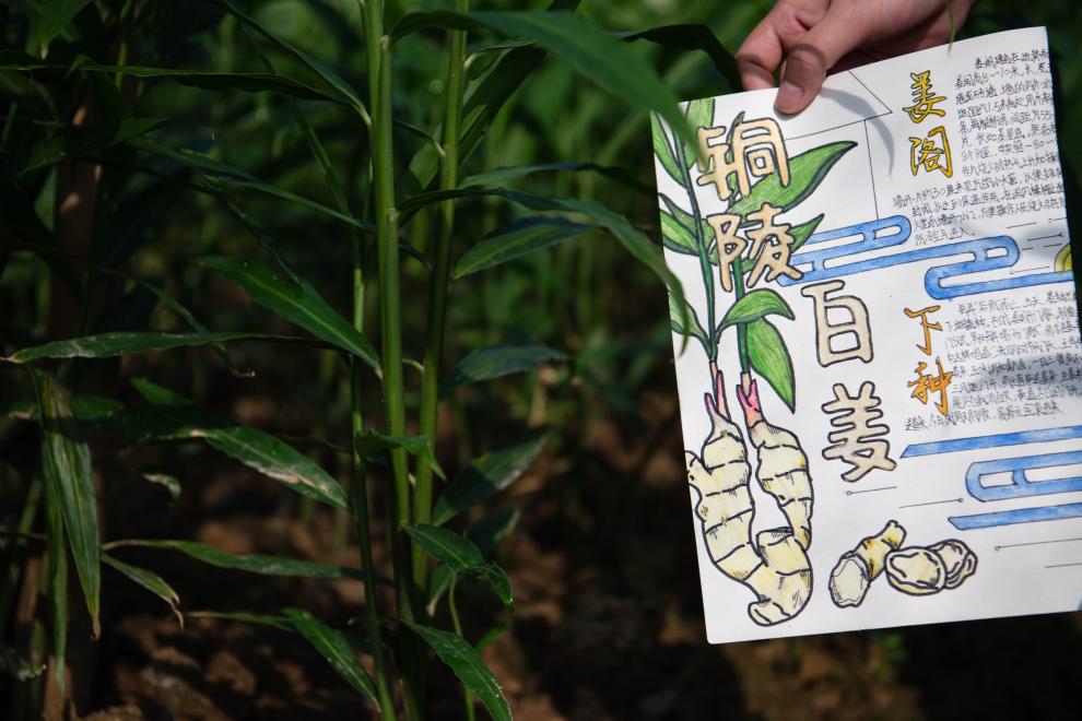 朱晴雨六七岁时就跟着妈妈许红丽在姜田里拔杂草。看着杂草逐渐填满篮子,年幼的她体会到了劳动带来的快乐。她喜欢待在姜田里,看看叶片的样子,瞧瞧上面的虫眼,然后把自己的观察写在周记里。“我和姜苗就像朋友一样,互相陪伴着长大。”朱晴雨说。