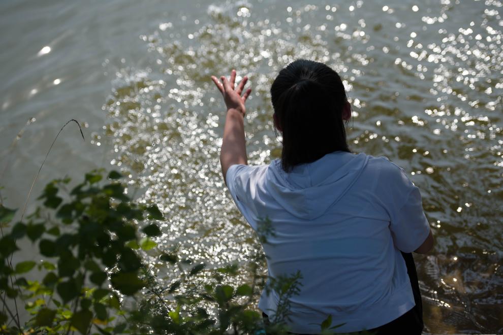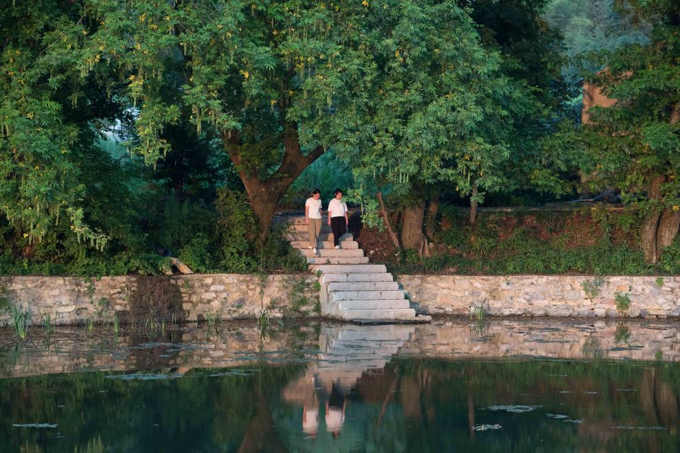 7月23日,在安徽省铜陵市郊区大通镇大院村,朱晴雨(右)和妈妈在池塘边休闲。新华社记者 张端 摄