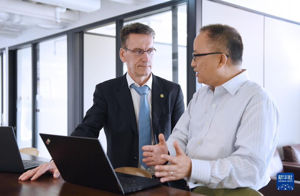 6月19日,思谋科技创始人兼董事长贾佳亚(右)在位于香港科技园的办公室里和同事交谈。 新华社记者 陈铎 摄
