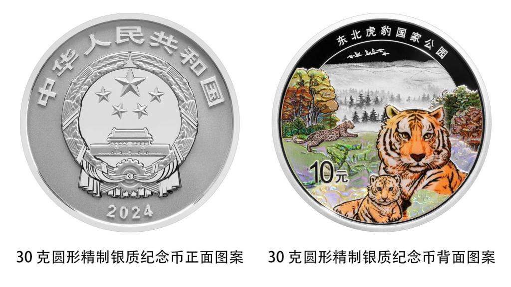 30克圆形银质纪念币背面图案为东北虎、东北豹、红松、白桦等元素装饰组合设计,并刊“东北虎豹国家公园”字样及面额,最大发行量60000枚。