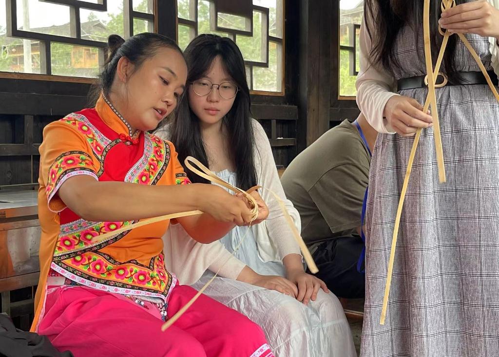 7月3日,香港学生在贵州省务川县龙潭村体验仡佬族“篾鸡蛋”编织技艺。新华社记者 骆飞 摄