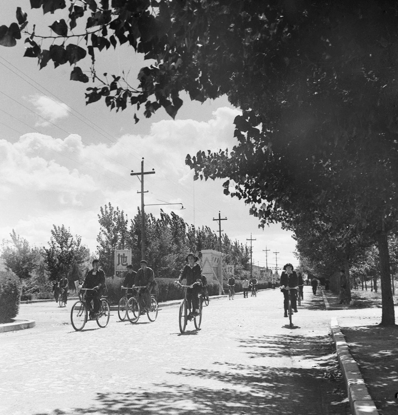 1958年,经纬纺织机械厂职工在厂区内骑车。