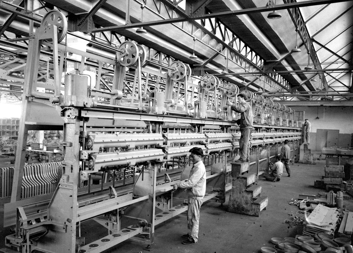 1965年,经纬纺织机械厂工人在装配长丝纺丝机。