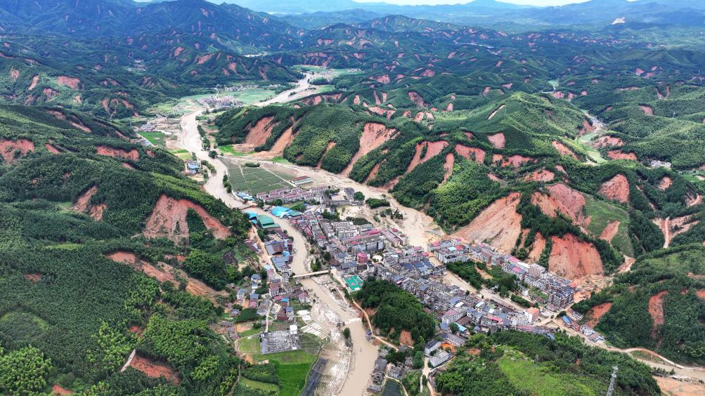 资兴市八面山瑶族乡一处被山体滑坡掩埋的道路已被疏通(7月30日摄,无人机照片)。新华社记者 陈振海 摄