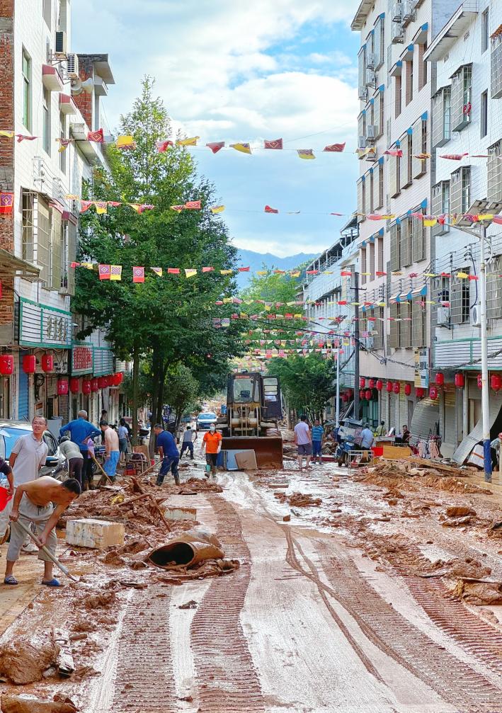 7月30日,在资兴市八面山瑶族乡集镇,当地干部群众正在清理街道上的淤泥。新华社记者 谢奔 摄