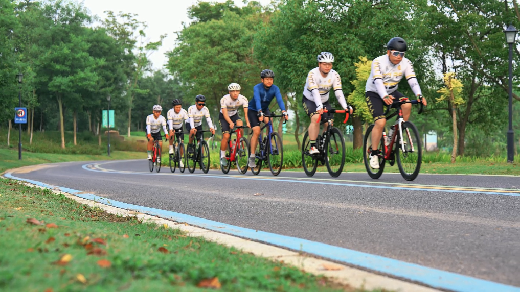 市民在蟒蛇河沿河公路上骑行。(葛晨 摄)