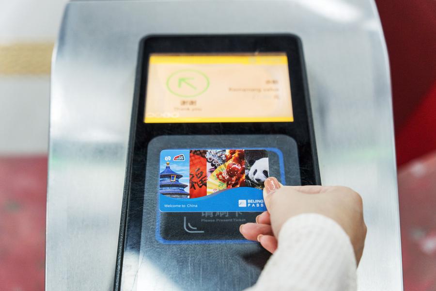 7月31日,一位用户刷“BEIJING PASS”乘坐北京轨道交通。新华社发