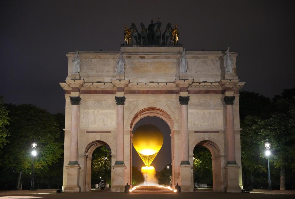 7月26日,热气球状的主火炬在卢浮宫的玻璃金字塔前点燃。新华社记者孙非摄