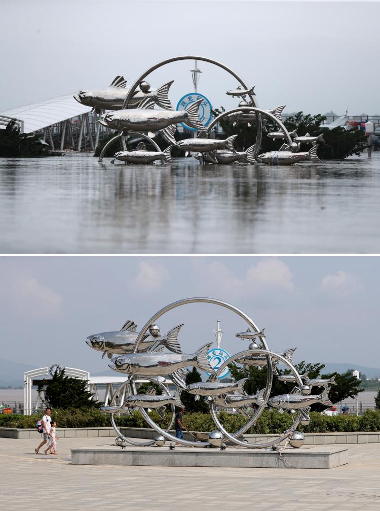 拼版照片:上图为7月30日在丹东市滨江中路拍摄的雕塑;下图为8月3日在丹东市滨江中路拍摄的雕塑。新华社记者 龙雷 摄