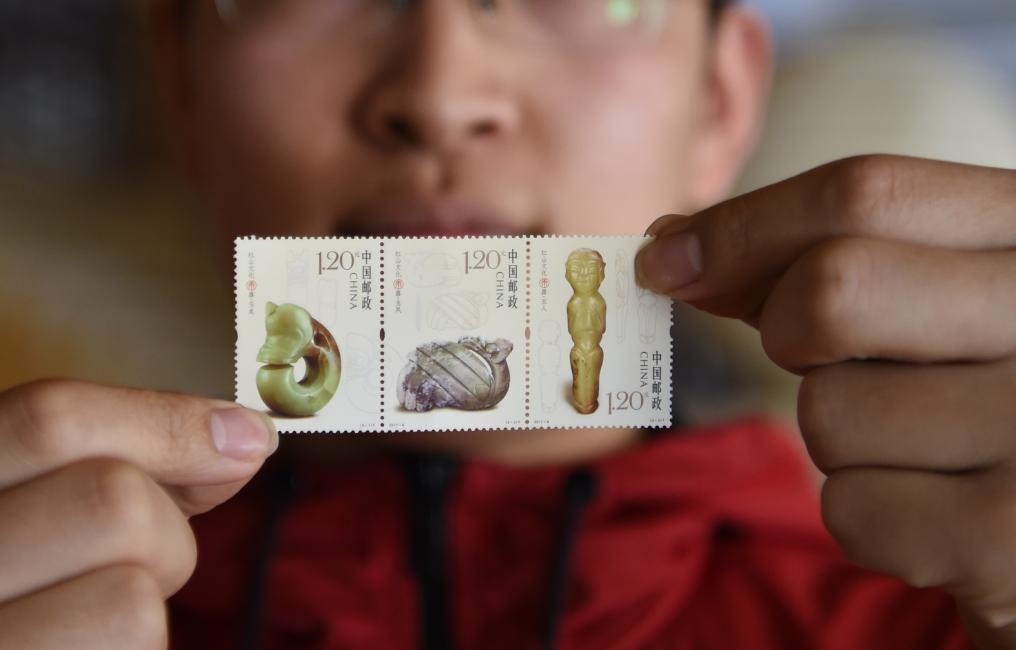 2017年4月9日,集邮爱好者在牛河梁遗址博物馆展示《红山文化玉器》特种邮票。