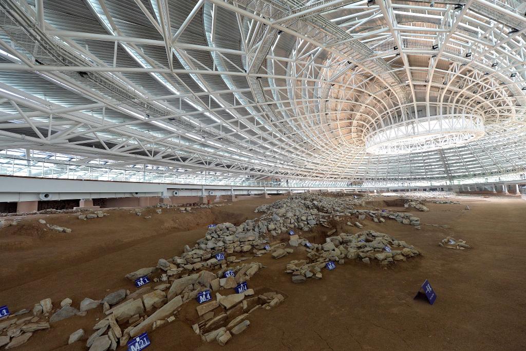 2014年6月14日拍摄的牛河梁国家考古遗址公园祭坛、积石冢保护展示馆内景。