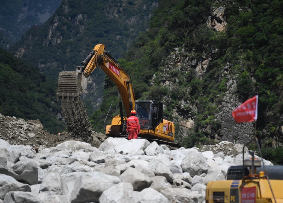 8月4日,在四川甘孜州康定市姑咱镇日地村,救援人员操作机械疏通国道318线(无人机照片)。新华社记者 刘坤 摄