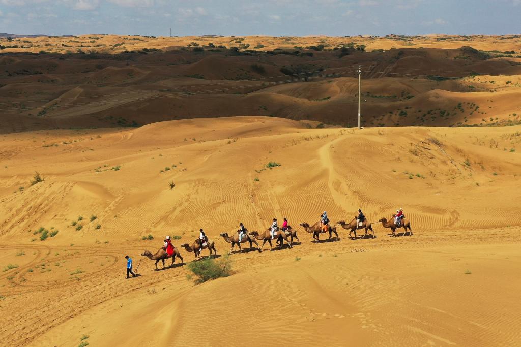 游客在银肯塔拉景区骑骆驼(无人机照片)。