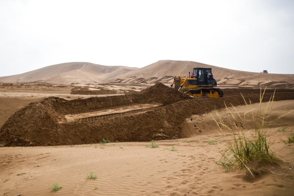 一辆推土机在银肯塔拉景区内的沙漠太空舱营地平整沙地,为营地咖啡厅等设施建设作准备。