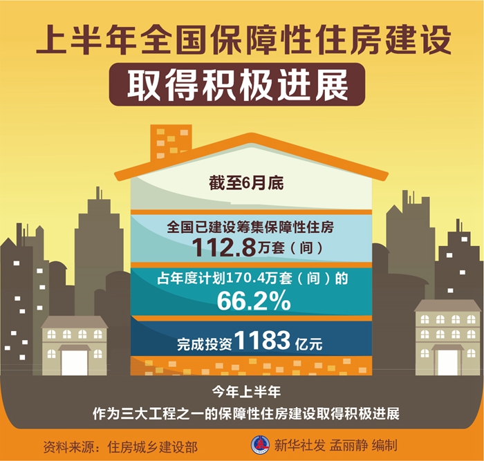 新华社北京8月6日电(记者樊曦、王优玲)记者6日从住房城乡建设部了解到,今年上半年,作为三大工程之一的保障性住房建设取得积极进展。截至6月底,全国已建设筹集保障性住房112.8万套(间),占年度计划170.4万套(间)的66.2%,完成投资1183亿元。