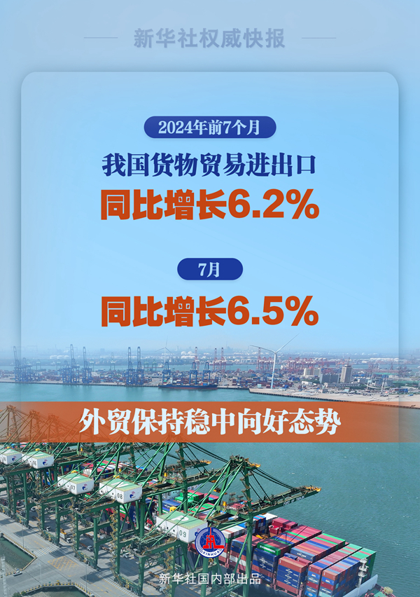新华社北京8月7日电(记者邹多为)海关总署7日发布数据:2024年前7个月,我国货物贸易进出口总值24.83万亿元,同比增长6.2%。其中7月当月进出口3.68万亿元,同比增长6.5%,月度增速连续4个月保持在5%以上。