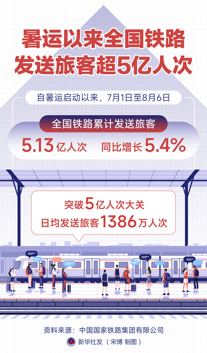 新华社北京8月7日电(记者樊曦)记者7日从中国国家铁路集团有限公司获悉,自暑运启动以来,7月1日至8月6日,全国铁路累计发送旅客5.13亿人次,同比增长5.4%,突破5亿人次大关,日均发送旅客1386万人次。