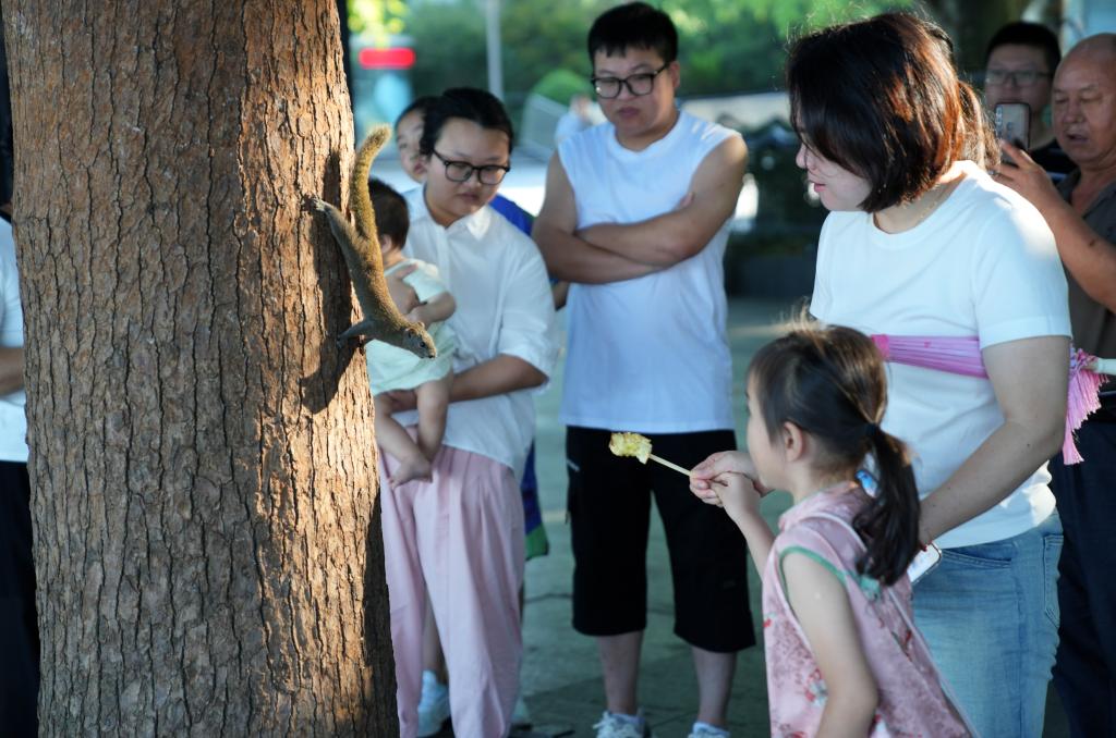8月2日,游客在杭州西湖边与小松鼠互动。新华社记者韩传号 摄