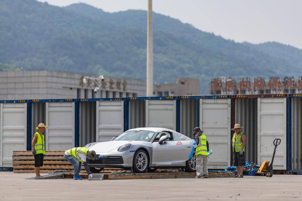 8月5日,在重庆国际物流枢纽园区内的重庆铁路口岸,工作人员对进口整车进行掏箱作业。新华社记者 黄伟 摄