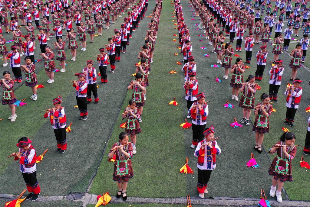 就在一个月前,这所民族小学的大课间增加了别具特色的箫笛演奏活动。2500多名学生身着各自民族服装,共同吹响箫笛,场面十分壮观。夏梦作为初学者,入门之后就十分着迷。