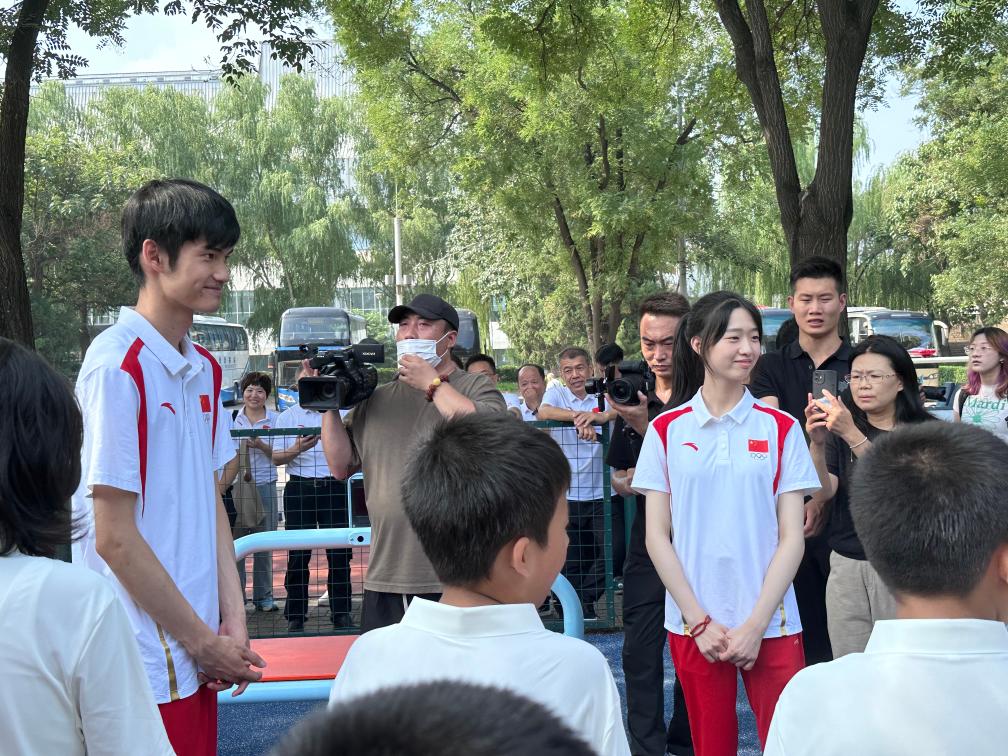 在国家奥体中心主会场,盛李豪、黄雨婷客串“体育老师”,与参加体育帮扶夏令营、来自革命老区山西省繁峙县平型关村、湖南省桑植县洪家关村的16名小朋友进行互动,带领他们进行热身运动,分享自己在奥运赛场上为国争光的心路历程。