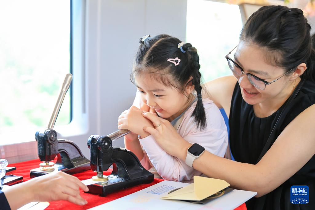8月8日,在G132次列车上,家长和孩子一起体验钢印制作书签。