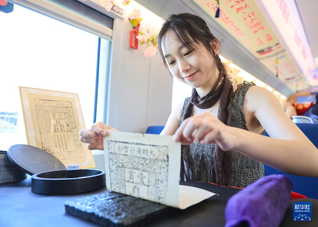 8月8日,在G7393次列车上,一名旅客在体验拓印。