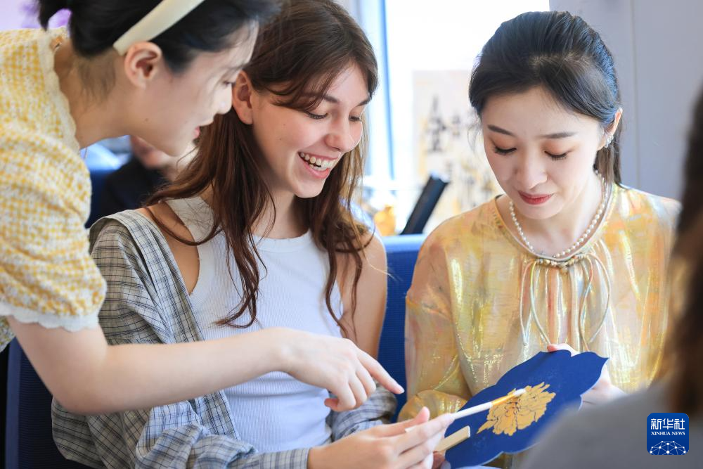 8月8日,在G7393次列车上,一名外国旅客体验制作金箔扇。