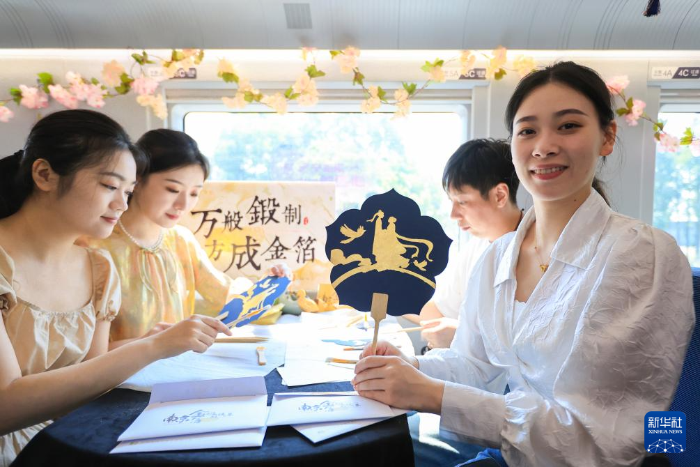 8月8日,在G7393次列车上,南京金箔锻制技艺江苏省级代表性传承人张丽向旅客展示金箔锻制中的切金箔工序。