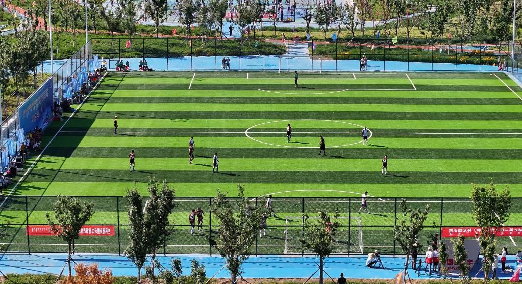 8月8日,在巴林右旗格斯尔体育公园里进行的一场足球比赛。新华社发(苏米雅 摄)