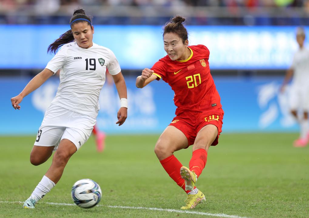 2023年10月6日,在杭州亚运会足球女子铜牌赛中,来自巴林右旗的中国队球员乌日古木拉(右)在比赛中射门。新华社记者 贾浩成 摄