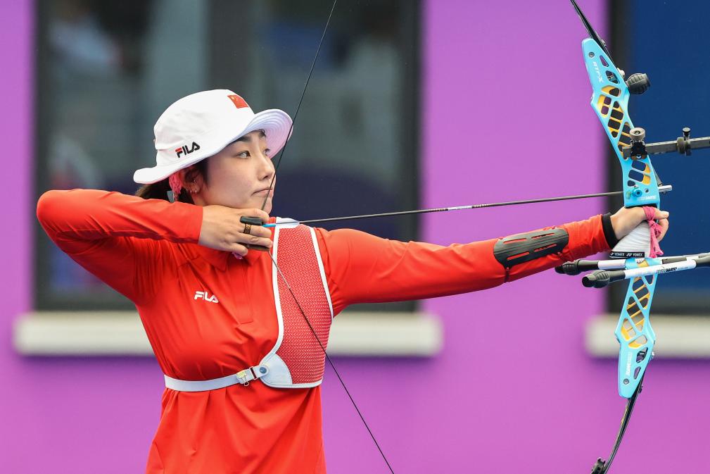 2023年10月6日,来自巴林右旗的中国队选手海丽玕在杭州亚运会射箭项目女子反曲弓团体比赛中。新华社记者 单宇琦 摄