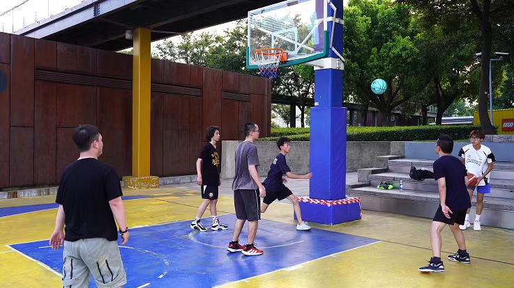 上海市民在露天篮球场切磋球技。新华社发(蔡佳辰 摄)