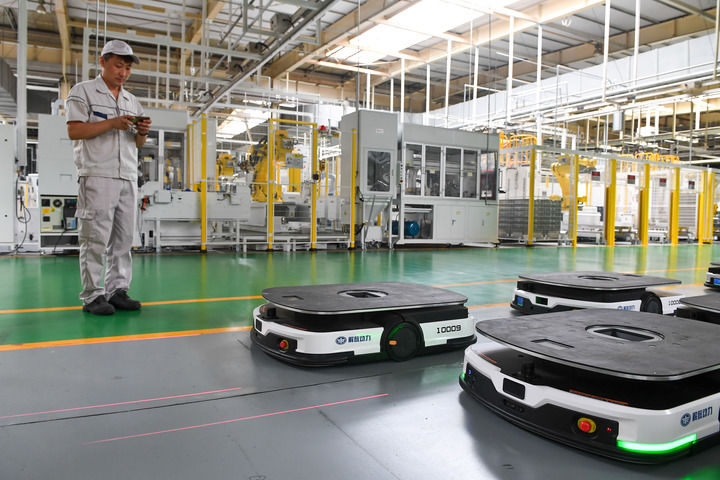 在一汽解放动力总成事业部长春工厂集成AMT车间,工人对AGV搬运机器人进行动作测试(2024年8月5日摄)。新华社记者 张楠 摄