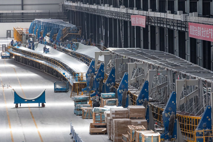 在一重龙申(齐齐哈尔)复合材料有限公司,工作人员在厂区进行风电叶片生产作业(2024年4月28日摄)。 新华社记者 谢剑飞 摄