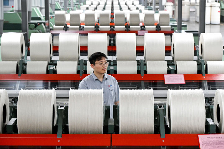 在青岛即发纺织科技有限公司,技术人员在维护新投入使用的智慧纺纱生产线(2024年4月9日摄)。新华社记者 李紫恒 摄