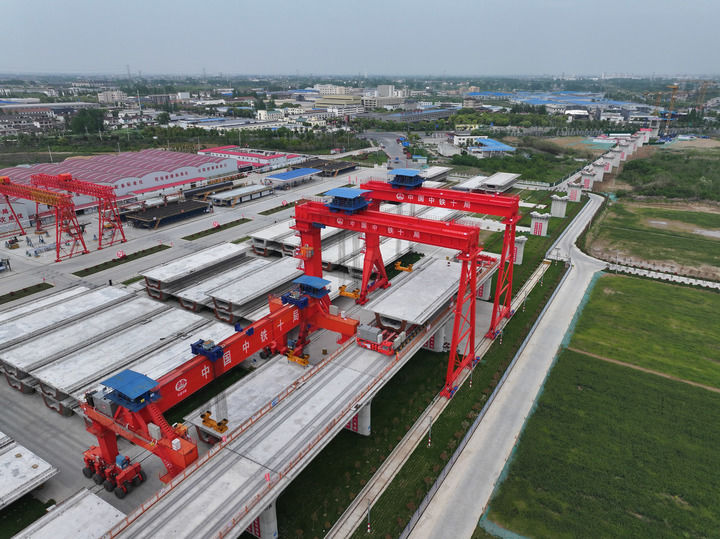 运梁车在沪渝蓉高铁沪宁段站前XII标施工现场作业(2024年4月25日摄,无人机照片)。新华社记者 季春鹏 摄