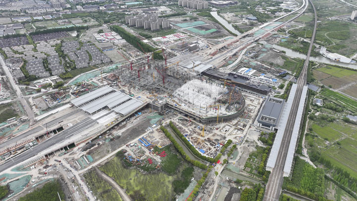 一台台起重机轰鸣,巨大塔吊运送沉甸甸的建筑材料。目前上海松江站主体结构施工已完成,建设重点已转向以幕墙、内装施工为主的装饰装修施工阶段。