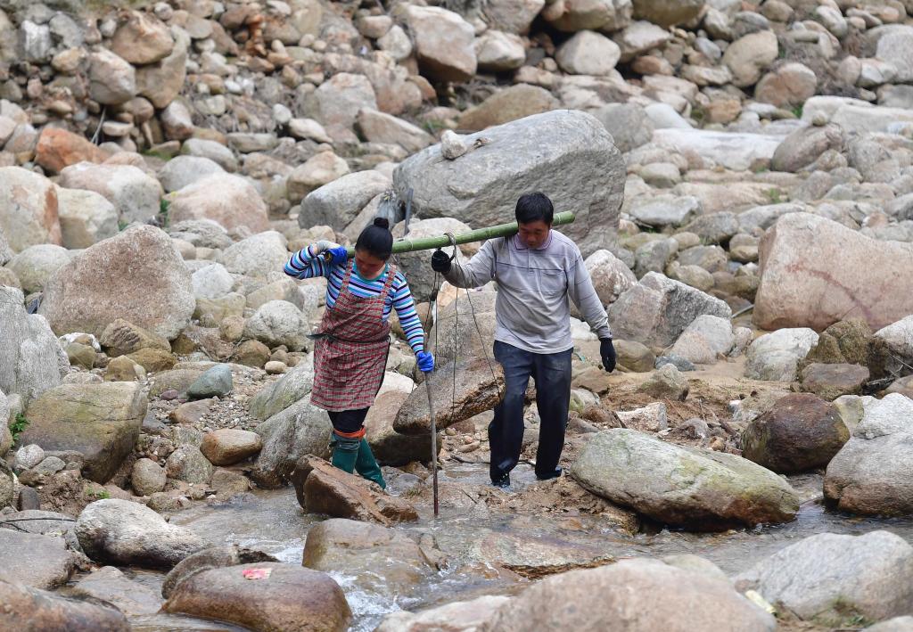 49岁的梁秀金(右)和妻子卜妹肉在合力抬石头,对河边的稻田进行加固。两人结婚29年,养育三个小孩(2018年3月16日摄)。