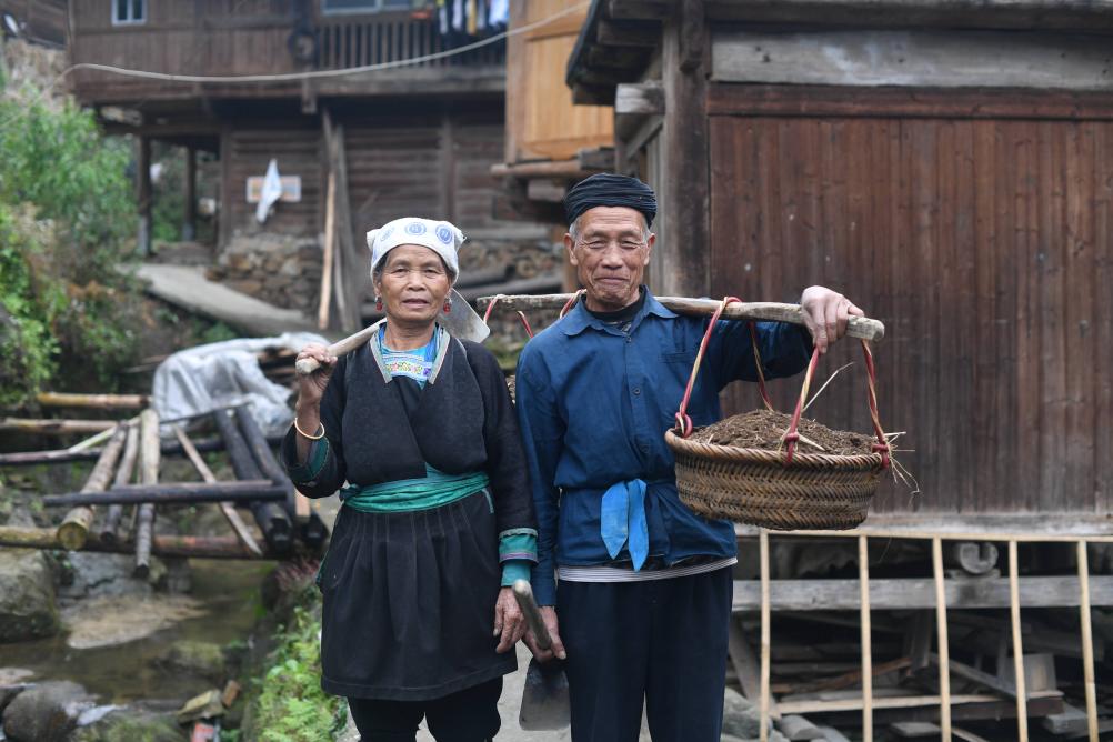 2017年11月,我第一次来到乌英苗寨。在古色古香的村落里,一对身着苗衣、肩扛农具的老人,肩并肩慢慢地走着。